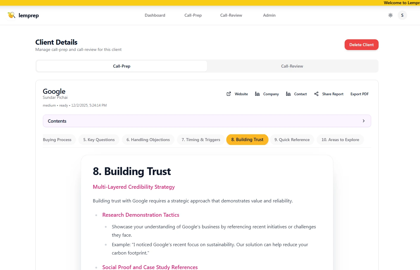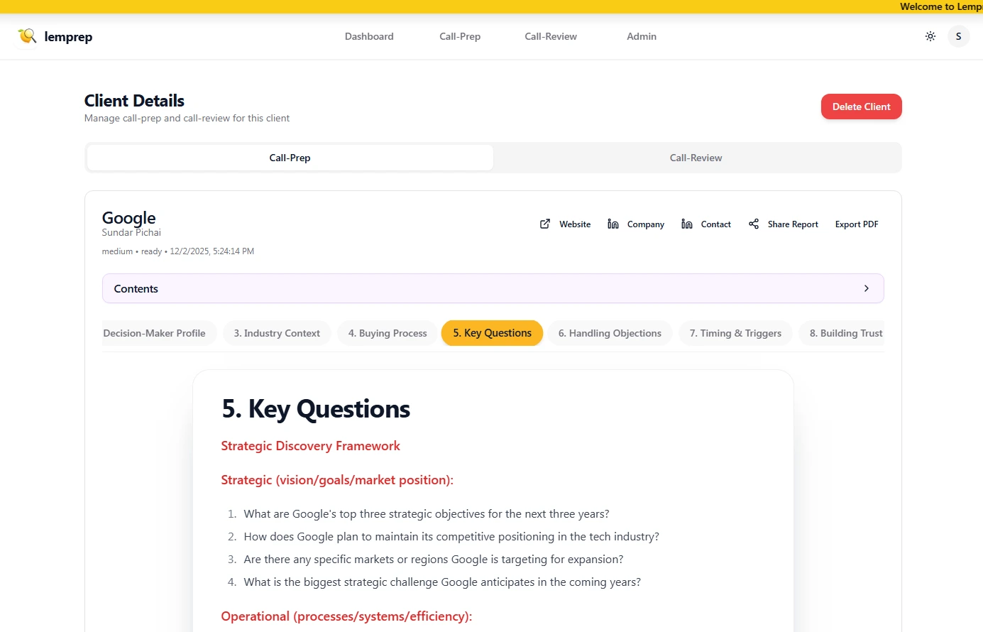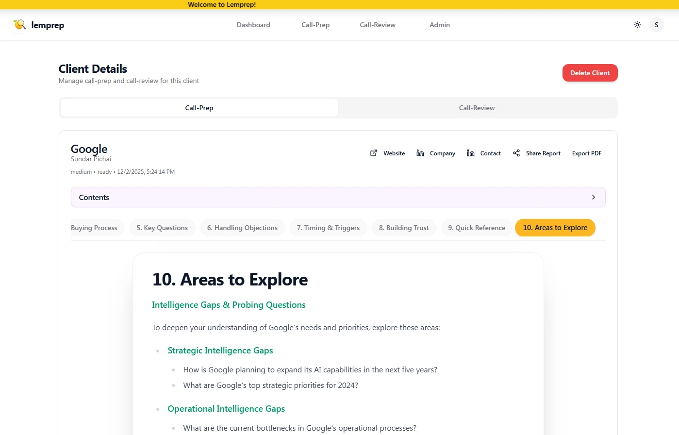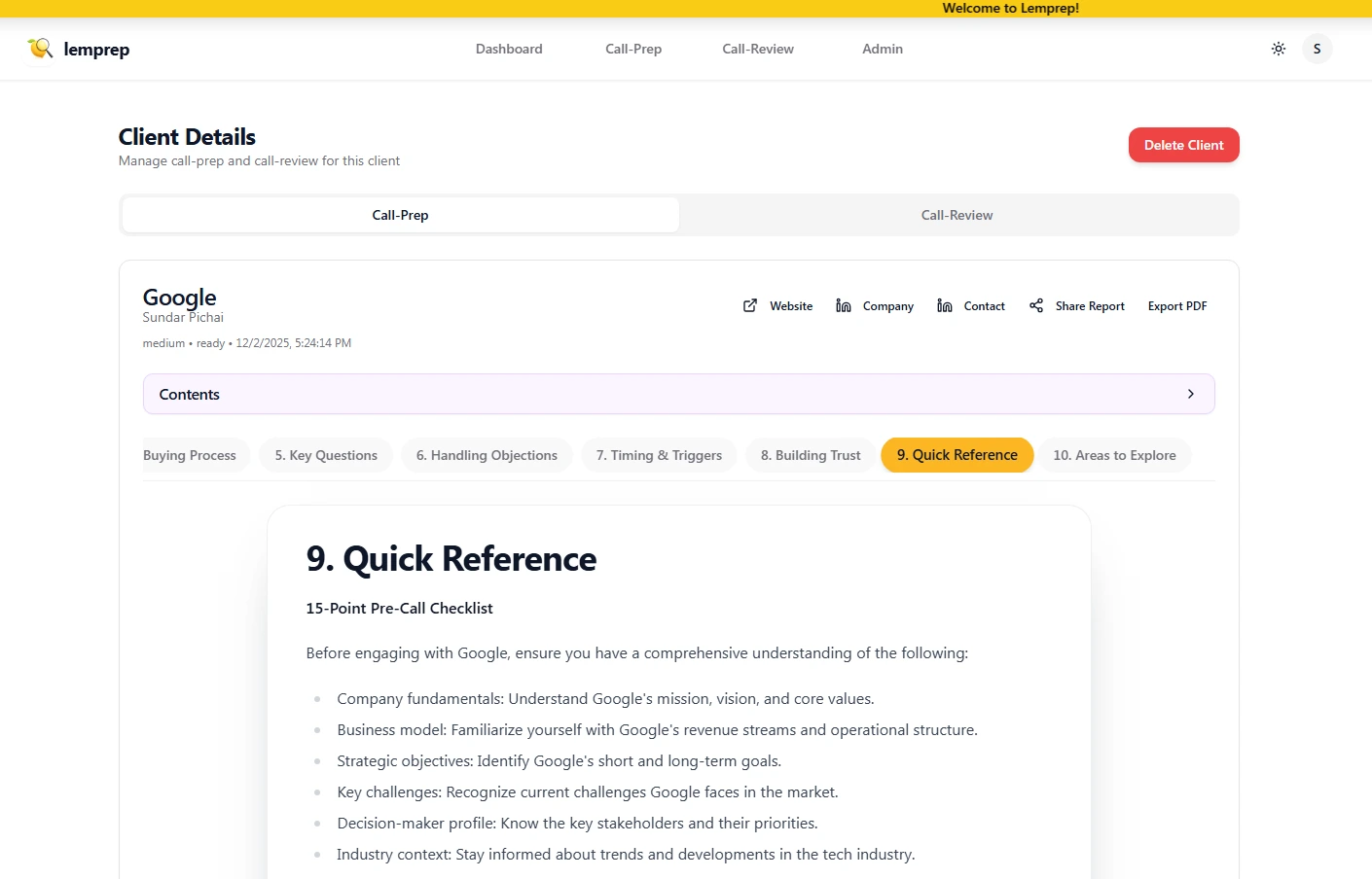 The team adopted Lemprep briefings for all first and second meetings, set a mandatory pre-call checklist, and exported reports to their CRM so managers could review prep quality. Reps used Prospect Intelligence for talk tracks and question trees, then sent follow-ups using the auto summary and action items.