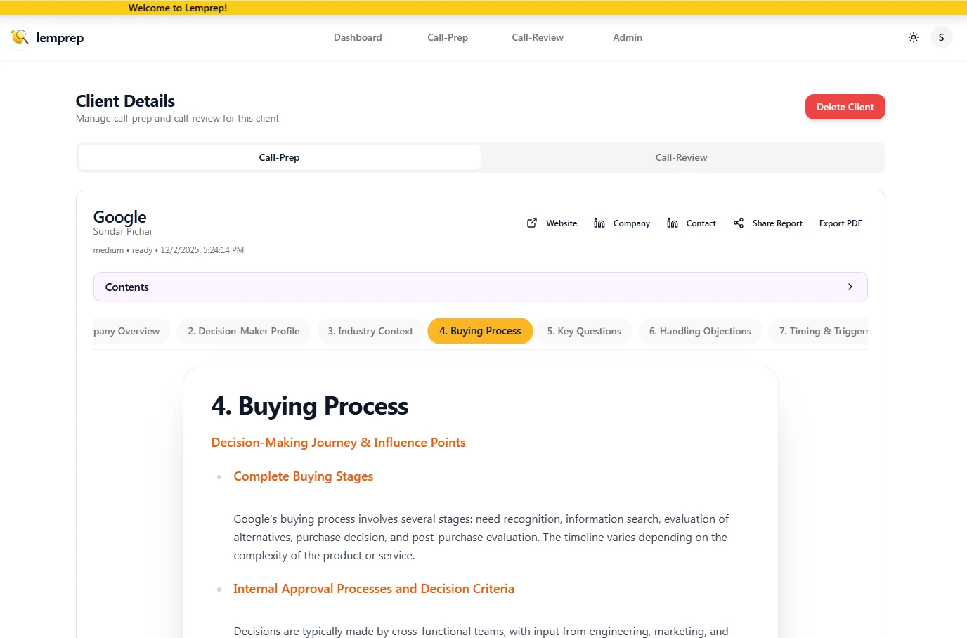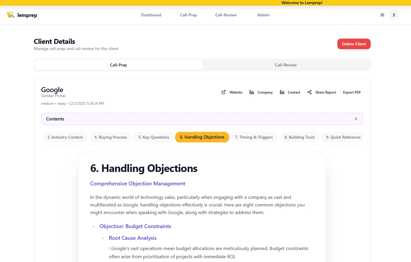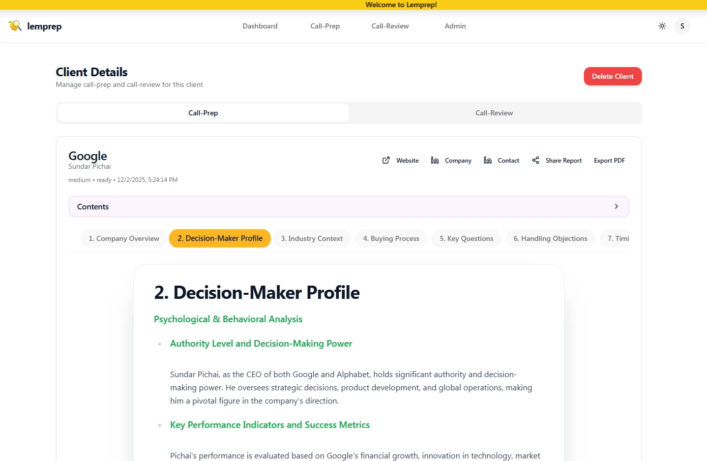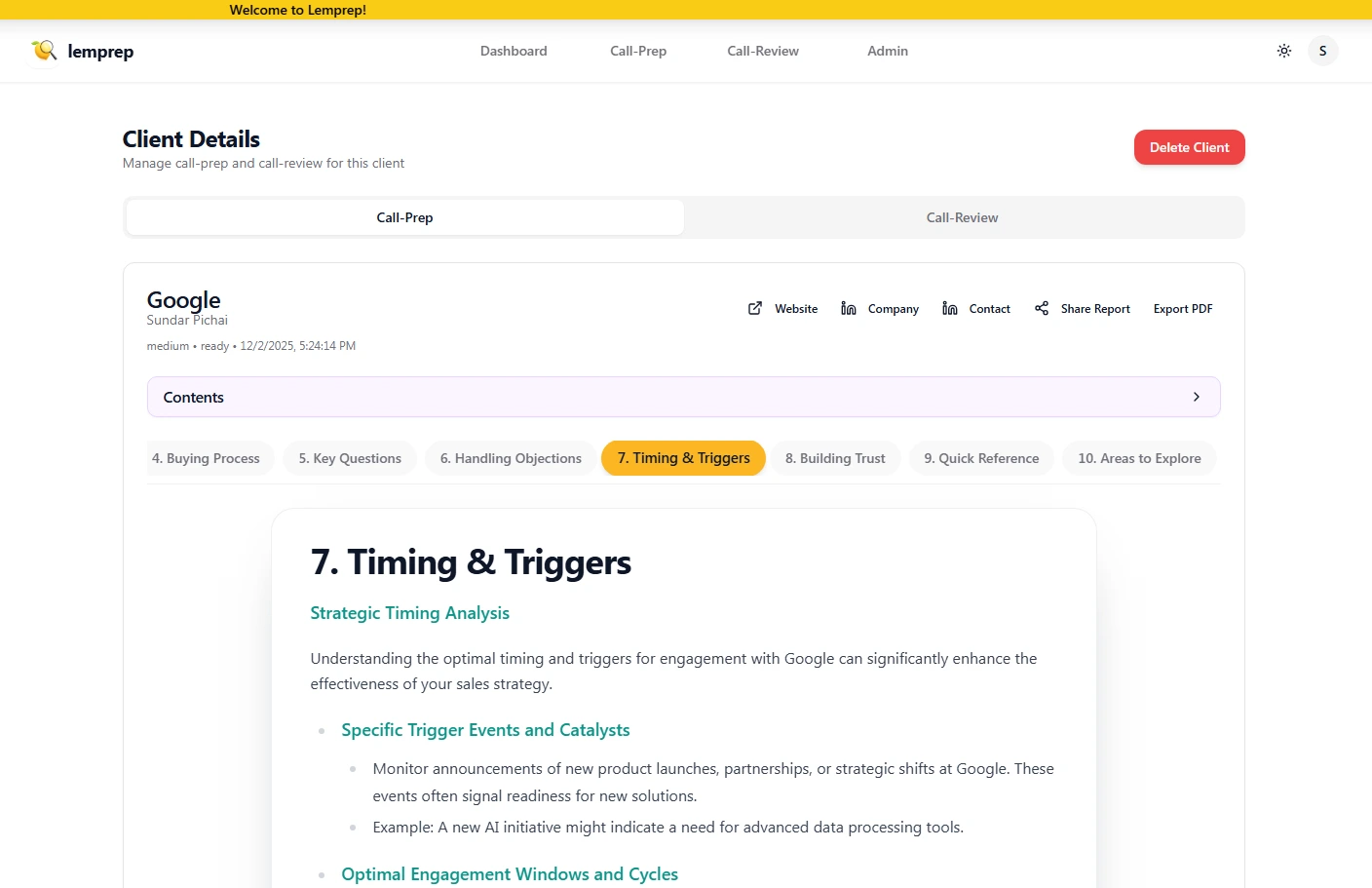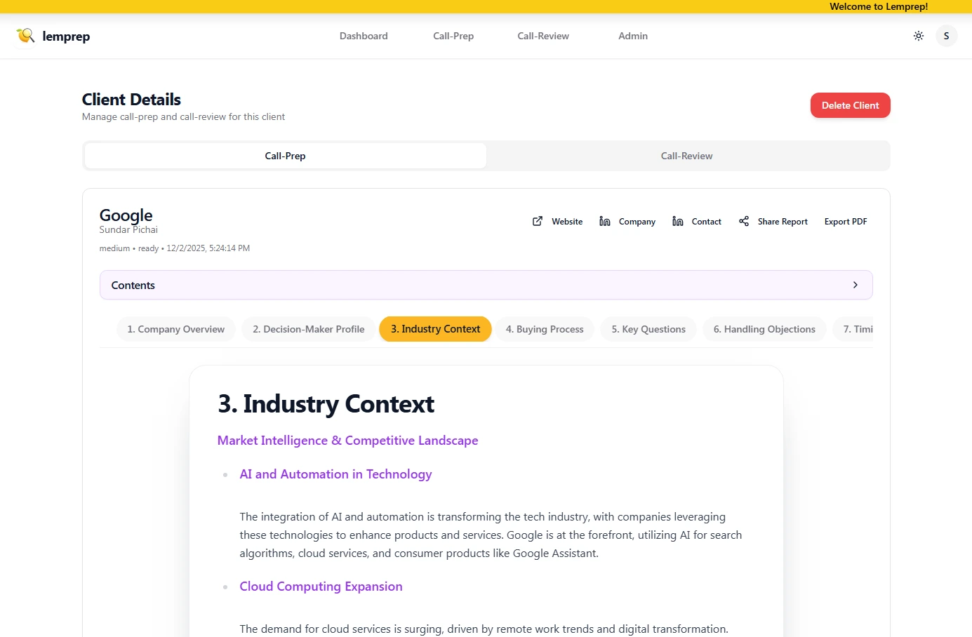 Lemprep delivers complete, AI-generated pre-call briefs in under 90 seconds.