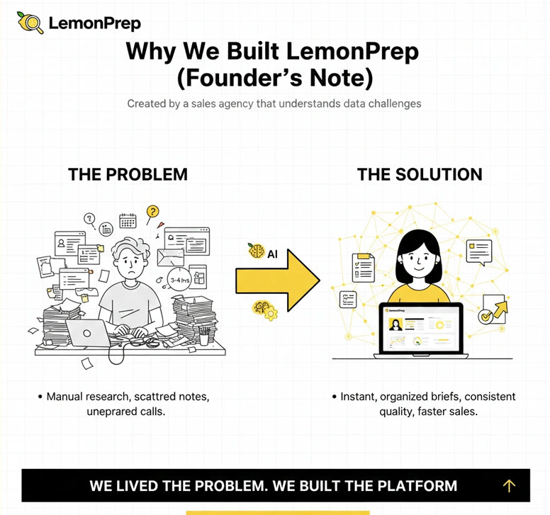 Lemprep began inside the Pearl Lemon Group when our teams were spending three to four hours on research for each meeting and still arriving with gaps. Preparation quality varied by person and region, which made coaching difficult and slowed pipeline movement. We needed a consistent way to convert a name and company into a dependable briefing with sources, role context, risks, and talking points in one place.