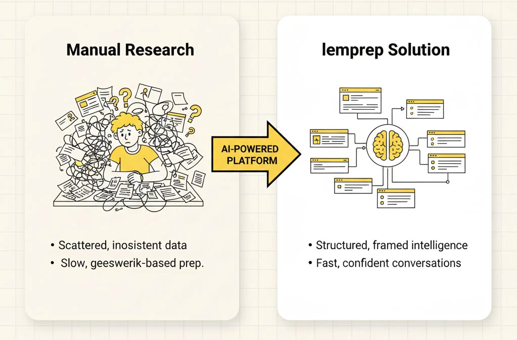 Most sales professionals prepare the same way they did five or ten years ago. They jump between browser tabs, skim a company website, search LinkedIn, guess at priorities, and hope they have enough context to not sound unprepared. This approach is slow, inconsistent and full of blind spots.