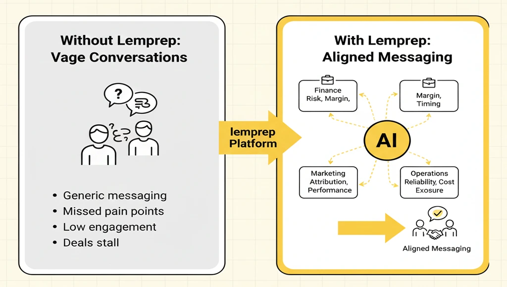 Lemprep surfaces what matters to each role. Finance leaders care about risk, margin, and timing. Marketing leaders care about pipeline, attribution, and performance. Operations leaders focus on reliability and cost exposure. Lemprep aligns messaging with these realities before the call starts.