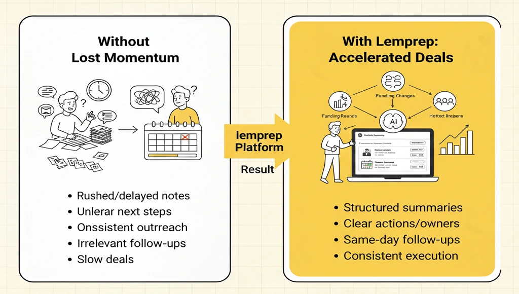 Lemprep converts meetings into structured summaries with clear actions so follow-ups happen the same day and remain consistent across the team.