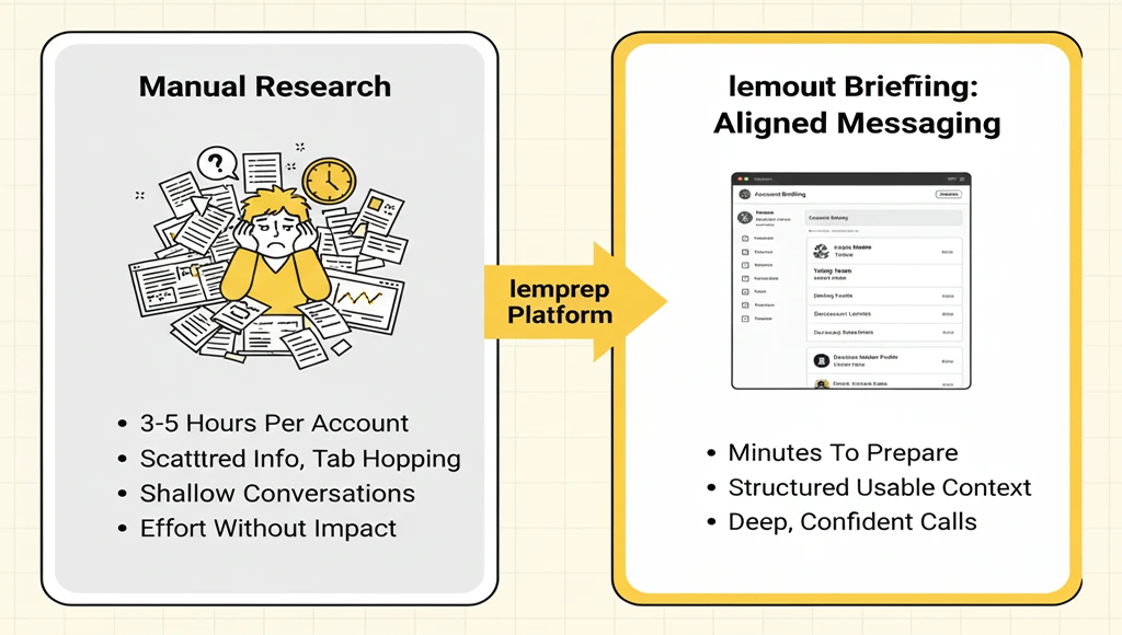 Sales reps, consultants, and founders regularly spend three to five hours researching a single account. That time disappears across LinkedIn profiles, company pages, news articles, and scattered notes. Despite the effort, conversations still start shallow.