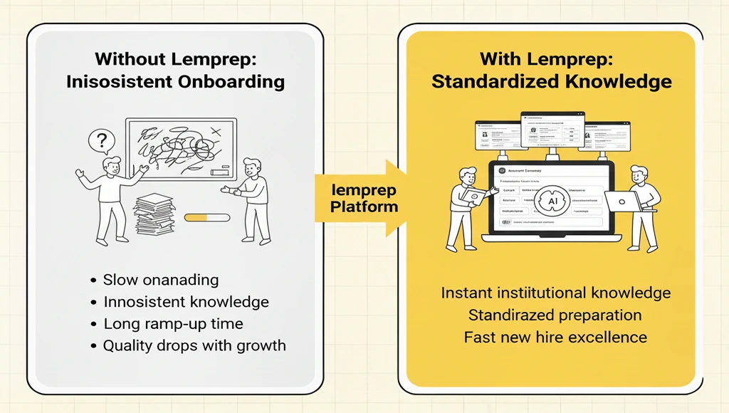 As teams grow, preparation quality drops. New hires take weeks to reach acceptable standards.