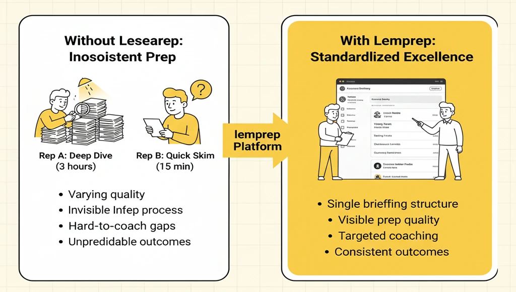 Large teams struggle with inconsistent preparation. Lemprep provides one standard briefing format across junior and senior reps.