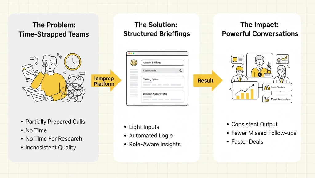 Lemprep removes that friction by turning light inputs into structured, role-aware sales briefings before calls, reviews, renewals, and internal planning sessions. The output is consistent. The logic is repeatable. The result is fewer weak conversations and fewer missed follow-ups.