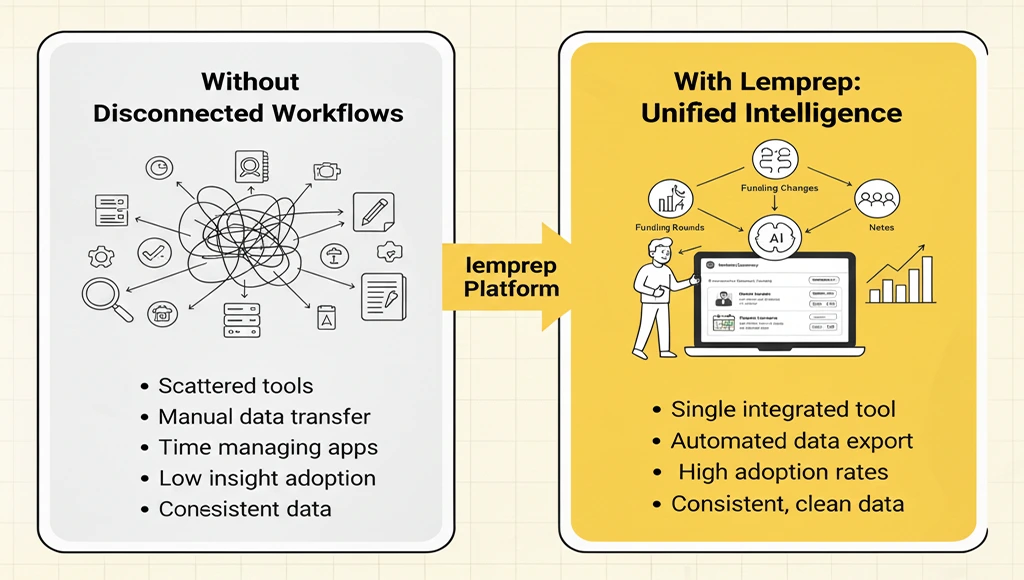 Research tools, note apps, and CRMs rarely connect cleanly. Teams spend more time managing tools than using insight.